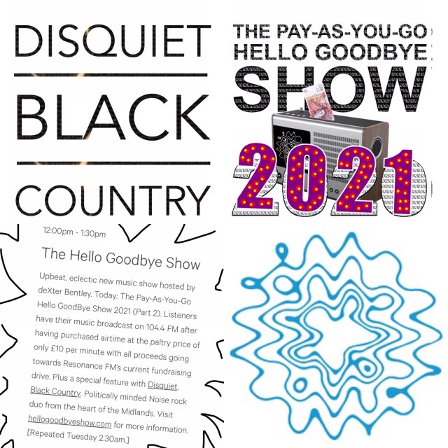 On Saturday 13th February 2021 deXter Bentley presented Part 2 of his annual Pay-As-You-Go Hello GoodBye Show Resonance FM fundraising extravaganza, plus a special feature on political punk pop Midlands duo Disquiet, Black Country.