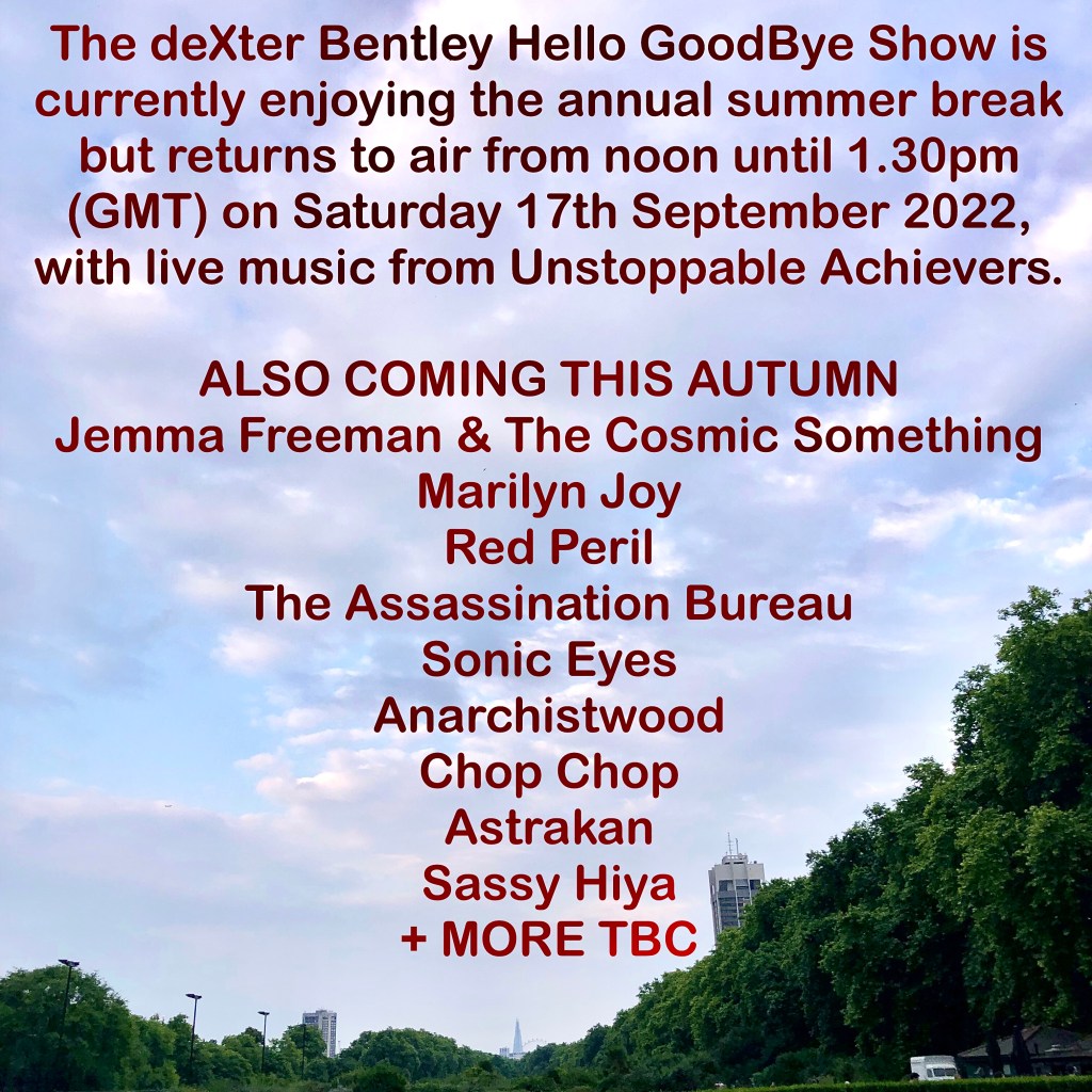 The deXter Bentley Hello GoodBye Show is currently enjoying the annual summer break but returns to air from noon until 1.30pm (GMT) on Saturday 17th September 2022, with live music from Unstoppable Achievers.